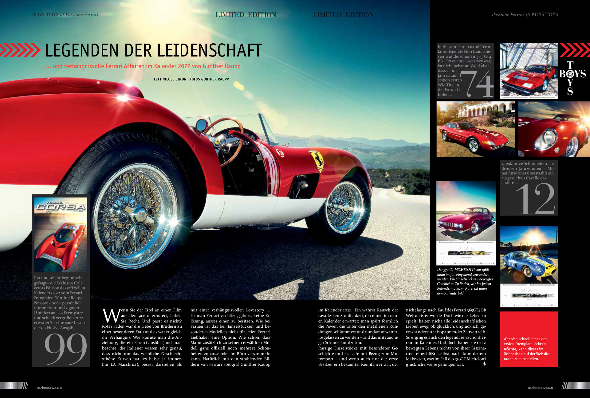 LEGENDEN DER LEIDENSCHAFT… und verhängnisvolle Ferrari Affairen im Kalender 2022 von Günther Raupp Wenn Sie der Titel an einen Film aus den 90ern erinnert, haben Sie Recht. Und passt es nicht? Roter Faden war die Liebe von Brüdern zu einer besonderen Frau und es war zugleich ihr Verhängnis. Wie könnte man die Anziehung, die ein Ferrari ausübt (und man beachte, die Italiener wissen sehr genau, dass nicht nur das weibliche Geschlecht schöne Kurven hat, es heisst ja immerhin LA Macchina), besser darstellen als mit einer verhängnisvollen Lovestory … Ist man Ferrari verfallen, gibt es keine Erlösung, ausser einen zu besitzen. Wie bei Frauen ist das bei Einzelstücken und besonderen Modellen nicht für jeden Ferrari Liebhaber eine Option. Wie schön, dass Mann zusätzlich zu seinem erwählten Modell ganz offiziell noch mehrere Schönheiten zuhause oder im Büro versammeln kann. Natürlich mit den strahlenden Bildern von Ferrari Fotograf Günther Raupp im Kalender 2022. Ein wahrer Rausch der cavallesken Sinnlichkeit, der einen im neuen Kalender erwartet: man spürt förmlich die Power, die unter den metallenen Rundungen schlummert und nur darauf wartet, losgelassen zu werden – und das mit rauchiger Stimme kundzutun.Rassige Einzelstücke mit besonderer Geschichte und fast alle mit Bezug zum Motorsport – und wenn auch nur der erste Besitzer ein bekannter Rennfahrer war, der nicht lange nach Kauf des Ferrari 365GT4 BB Weltmeister wurde. Doch wie das Leben so spielt, halten nicht alle leidenschaftlichen Lieben ewig, ob glücklich, unglücklich, gecrasht oder nur als spannender Zeitvertreib. So erging es auch den legendären Schönheiten im Kalender. Und doch haben sie trotz bewegten Lebens nichts von ihrer Faszination eingebüßt, selbst nach komplettem Make-over, was im Fall des 330GT Michelotti glücklicherweise gelungen war.