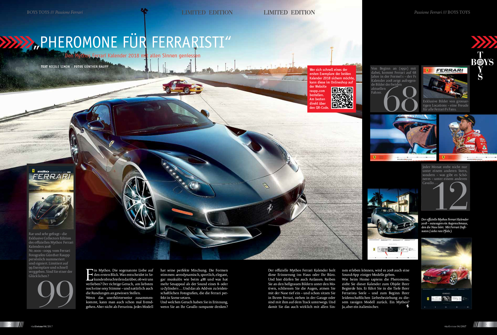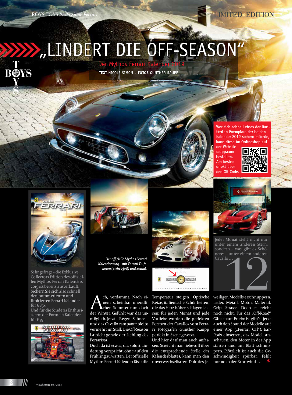 „LINDERT DIE OFF-SEASON“Der Mythos Ferrari Kalender 2019 Ach, verdammt. Nach ei­nem scheinbar unendli­chen Sommer nun doch der Winter. Gefühlt war das un­möglich. Jetzt – Regen, Schnee – und das Cavallo rampante bleibt vermehrt im Stall. Die Off­-Season ist nicht gerade der Liebling des Ferrarista.Doch da ist etwas, das sofort Lin­derung verspricht, ohne auf den Frühling zu warten. Der offizielle Mythos Ferrari Kalender lässt die Temperatur steigen. Optische Reize, italienische Schönheiten, die das Herz höher schlagen las­sen; für jeden Monat und jede Vorliebe wurden die perfekten Formen der Cavallos vom Ferra­ri Fotografen Günther Raupp perfekt in Szene gesetzt.Und hier darf man auch anfas­sen. Streicht man liebevoll über die entsprechende Stelle des Kalenderblattes, kann man den unverwechselbaren Duft des je­weiligen Modells erschnuppern. Leder. Metall. Motor. Material. Grip. Strasse. Doch es reicht noch nicht. Für das „Off­-Road“ Gänsehaut­-Erlebnis gibt’s jetzt auch den Sound der Modelle auf einer App („Ferrari Cal“). Ear­Pods einsetzen, das Modell an­schauen, den Motor in der App starten und am Blatt schnup­pern. Plötzlich ist auch die Ge­schwindigkeit spürbar. Fehlt nur noch der Fahrtwind …