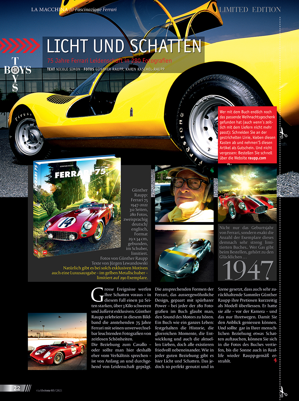 „LICHT UND SCHATTEN“75 Jahre Ferrari Leidenschaft in 280 Fotografien Grosse Ereignisse werfen Ihre Schatten voraus – in diesem Fall einen 312 Seiten starken, über 3 Kilo schweren und äußerst exklusiven. Günther Raupp zelebriert in diesem Bildband die anstehenden 75 Jahre Ferrari mit seinen unverwechselbar leuchtenden Fotografien von zeitlosen Schönheiten. Die Beziehung zum Cavallo – oder sollte man hier deshalb eher vom Verhältnis sprechen – ist von Anfang an und durchgehend von Leidenschaft geprägt. Die ansprechenden Formen der Ferrari, das aussergewöhnliche Design, gepaart mit spürbarer Power – bei jeder der 280 Fotografien im Buch glaubt man, den Sound des Motors zu hören. Ein Buch wie ein ganzes Leben: festgehalten die Historie, die glorreichen Momente, die Entwicklung und auch die aktuellen Lieben, doch alle existieren friedvoll nebeneinander. Wie in jeder guten Beziehung gibt es hier Licht und Schatten. Das jedoch so perfekt genutzt und in Szene gesetzt, dass auch sehr zurückhaltende Sammler Günther Raupp ihre Pretiosen kurzzeitig als Modell überliessen. Er hatte sie alle – vor der Kamera – und das nur Ihretwegen. Damit Sie den Anblick geniessen können. Und sollte gar in Ihrer menschlichen Beziehung etwas Schatten auftauchen, können Sie sich in die Fotos des Buches vertiefen, bis die Sonne auch in Reallife wieder Raupp-gemäß er­strahlt.