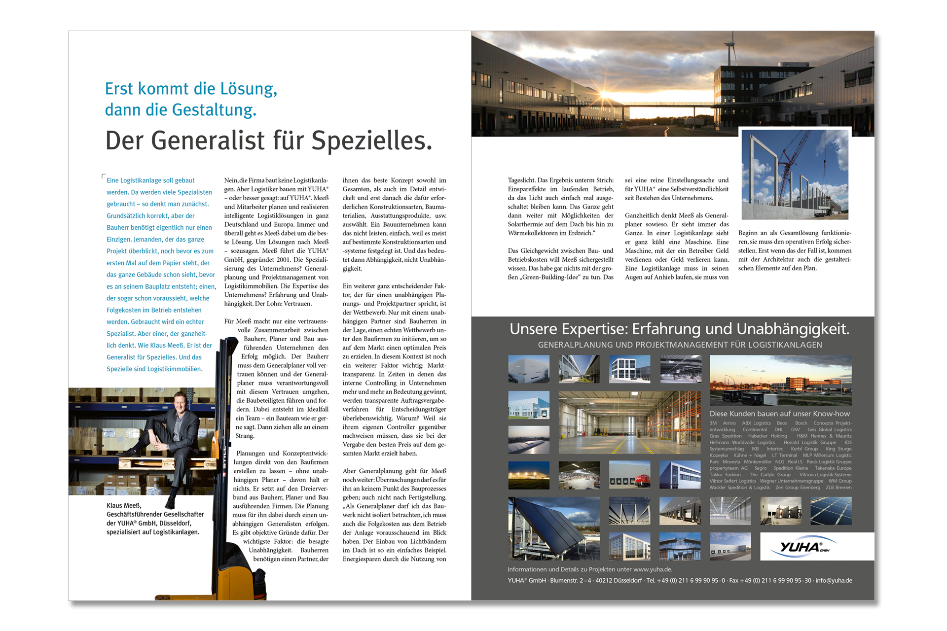 Sloganentwicklung:YUHA® GmbH –Visionen. Know-how. Qualität. Architekten für Logistikimmobilien und IndustriebauBeratung · Planung · Steuerung .................................................Klaus Meeß, Geschäftsführender Gesellschafter der YUHA® GmbH über die Zusammenarbeit mit garanten: „Mit den garanten, insbesondere mit Nicole Simon verbindet uns eine inzwischen über 20 Jahre währende kreative, konstruktive und vertrauensvolle Zusammenarbeit. In allen Belangen der Gestaltung, angefangen von Visitenkarten, über Flyer bis hin zur Aufstellung und Gestaltung unsere Homepage haben uns die garanten immer bestens beraten und betreut. Selbst unsere Kunden waren von unserem professionellen Erscheinungsbild im Marketing immer sehr begeistert.Und auch in den nächsten Jahren werden wir den garanten treu bleiben, da sich deren Designvorstellungen immer auch zeitgeistentsprechend mitentwickelt. Wir freuen uns auf eine gemeinsame Zukunft ..."
